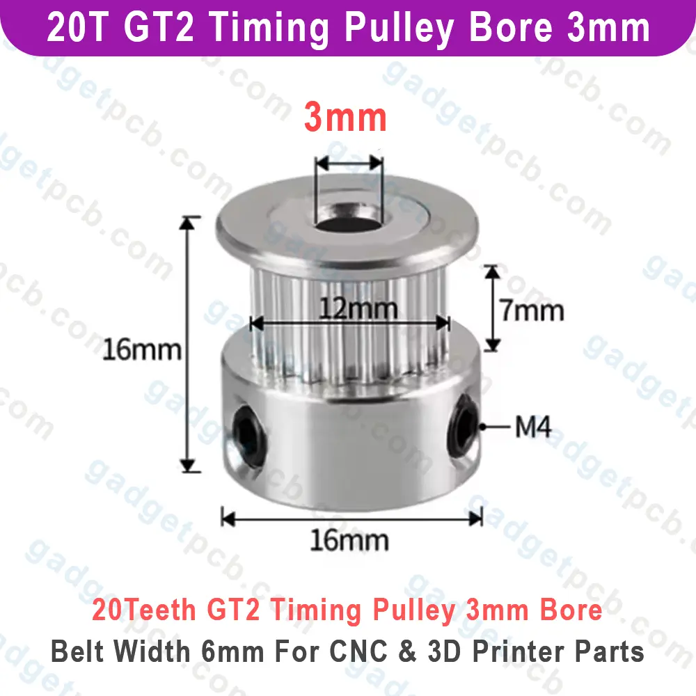 20 Tooth Bore 3mm: GT2 Synchronous Wheel with 20 Tooth, 3mm bore diameter and width 16mm, height 16mm High Quality Aluminum Material: Aluminum 20 tooth GT2 timing pulley has high quality shiny surface appearance and robust construction, Longer Working Life