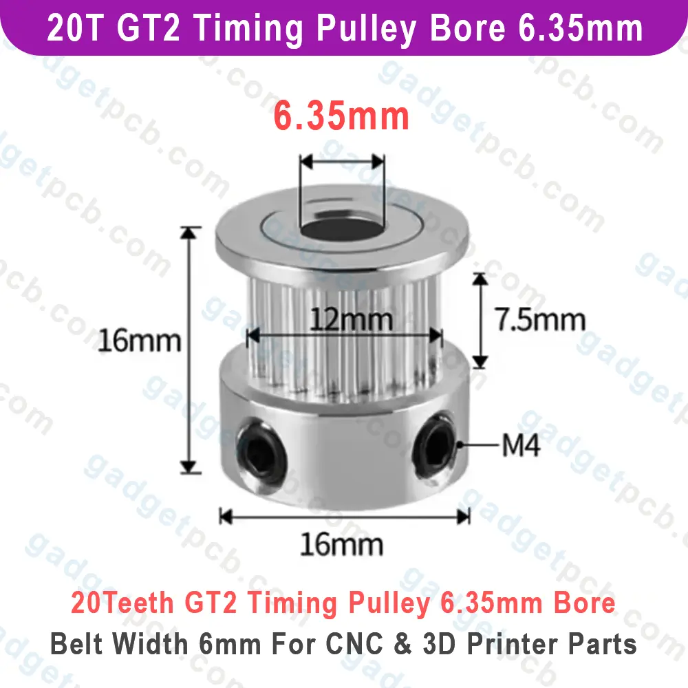 20 Tooth Bore 6.35mm: GT2 Synchronous Wheel with 20 Tooth, 6.35mm bore diameter and width 16mm, height 16mm High Quality Aluminum Material: Aluminum 20 tooth GT2 timing pulley has high quality shiny surface appearance and robust construction, Longer Working Life