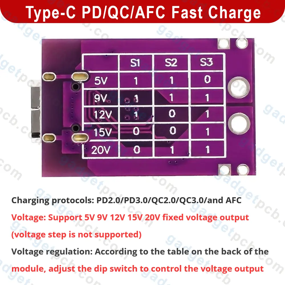 Supported Voltage Levels: This module supports various output voltages including 5V, 9V, 12V, 15V, and 20V. Please note that voltage jumping between these levels is not supported. Fast Charging Protocols: The module is compatible with fast charging protocols such as for PD2.0, for PD3.0, for QC2.0, for QC3.0, and for AFC, making it suitable for efficient charging of devices.