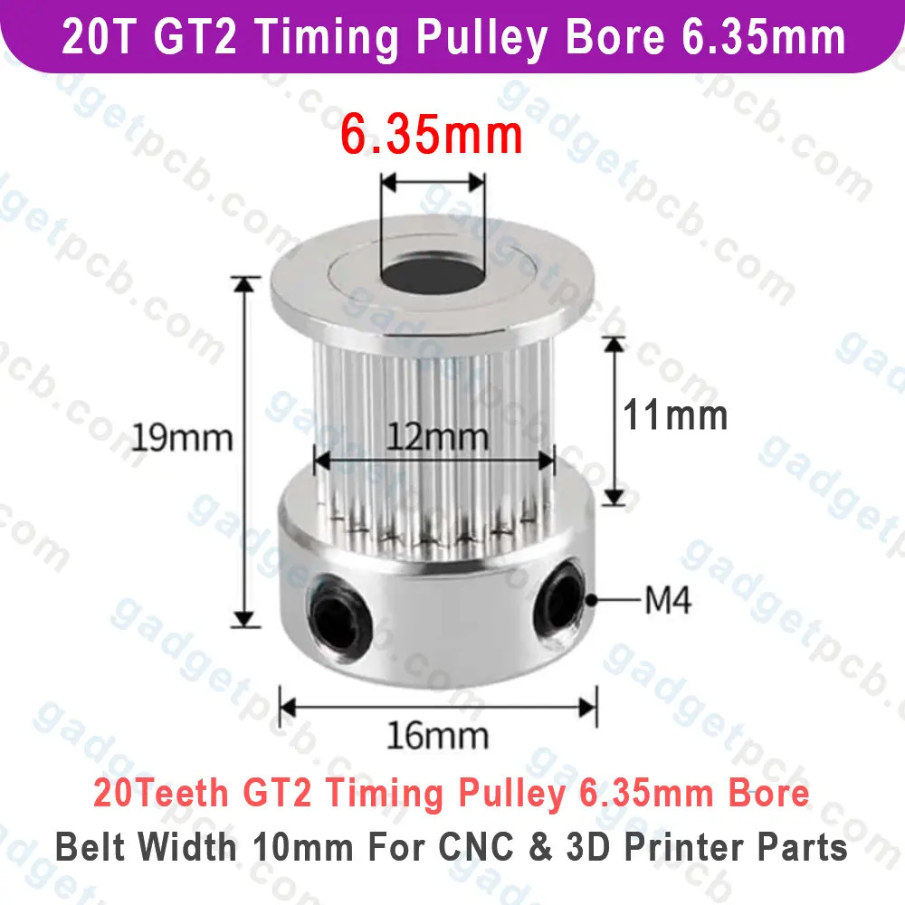 20 Tooth Bore 6.35mm: GT2 Synchronous Wheel with 20 Tooth, 6.35mm bore diameter and width 16mm, height 19mm High Quality Aluminum Material: Aluminum 20 tooth GT2 timing pulley has high quality shiny surface appearance and robust construction, Longer Working Life